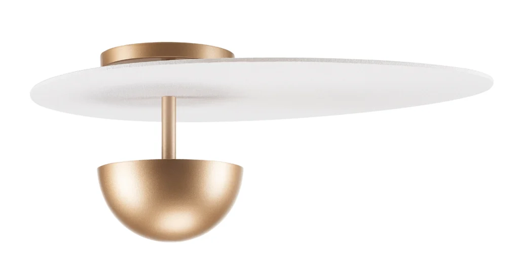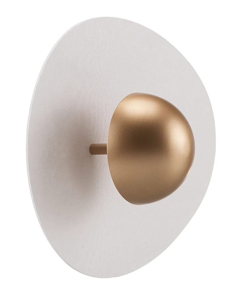 Um jogo sutil entre formas e deslocamentos, onde o equilíbrio se revela na assimetria. A cúpula oval, suavemente deslocada, parece desafiar a gravidade, enquanto a luz indireta se espalha delicadamente pelo tecido que a reveste. Uma peça assimétrica e robusta, que surpreende pela leveza e pela harmonia de suas proporções.